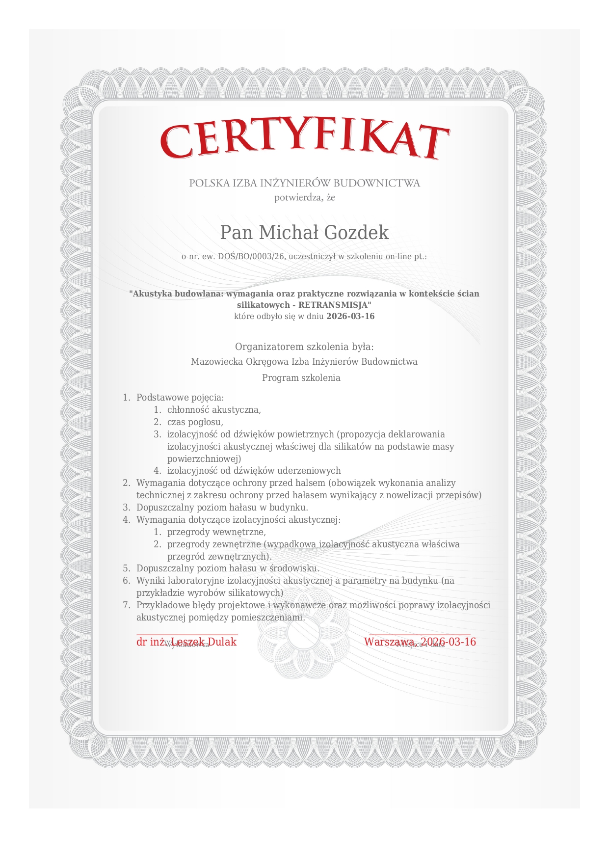 - Uczestnik wielu kursów, szkoleń i sympozjów organizowanych przez Izbę Inżynierów Budownictwa